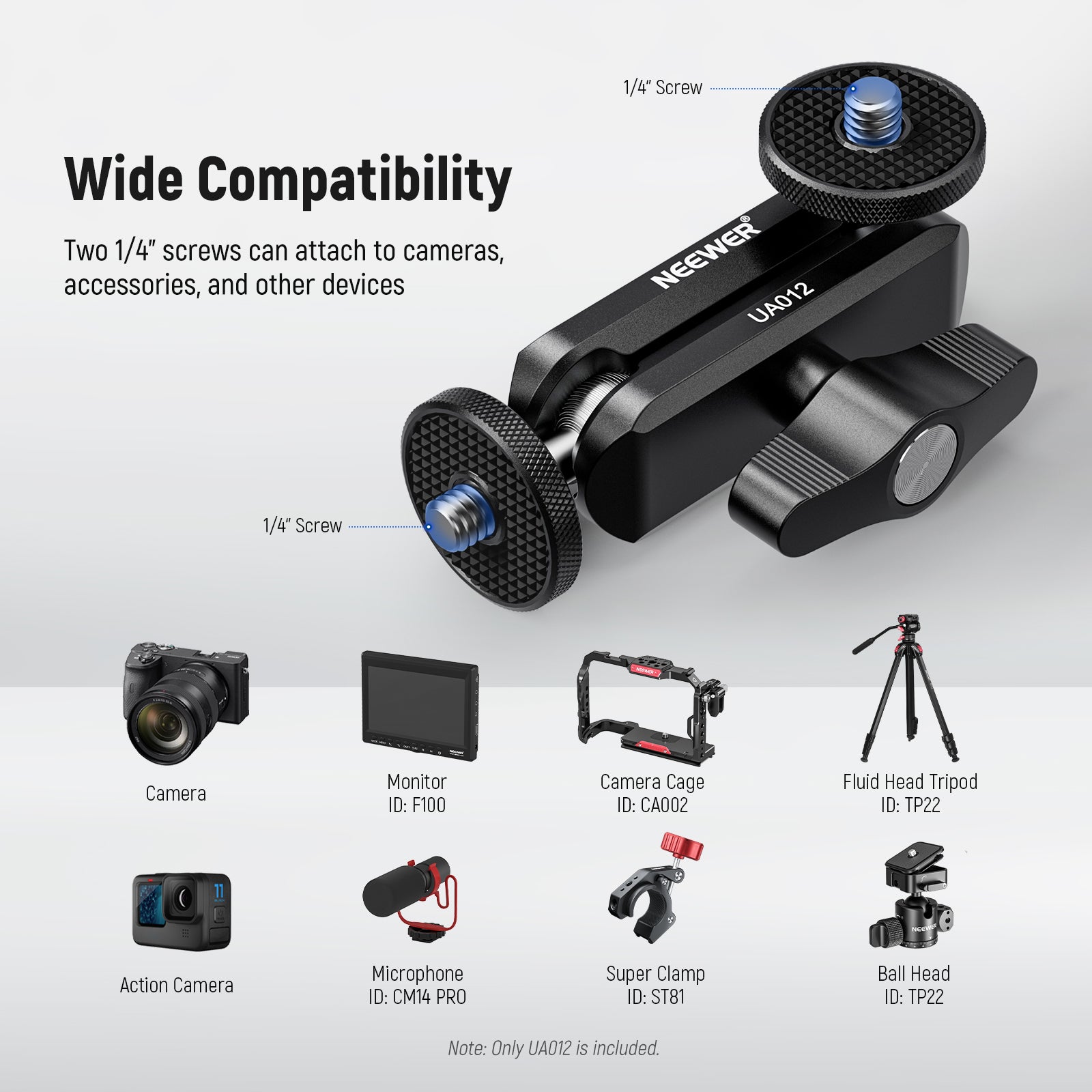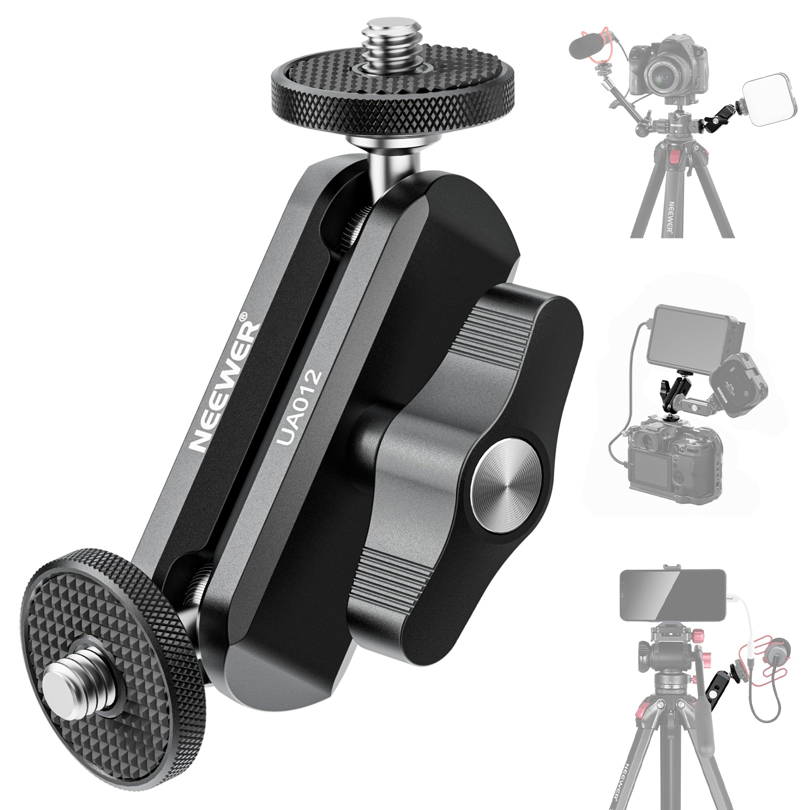 - Universal 1/4" Screws & Threaded Holes- Two 1/4" screws can attach the magic arm to a camera cage, top handle, or tripod and mount a field monitor, LED fill light, smartphone holder, microphone, or vlog camera at the same time. The magic arm also has two 1/4" threads for connecting other magic arms and accessories