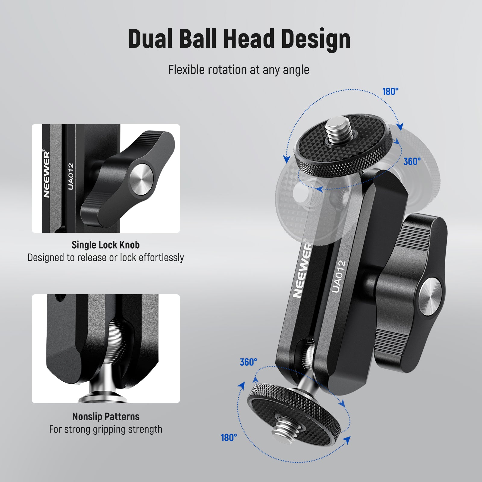 - Dual Ball Head Design- With two 360° rotatable ball heads, the magic arm lets you capture images and record videos from any angle. They also have a 180° tilt movement through U shaped notches for broadened visions