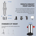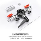 - Adjustable Dual Female 5/8" Stud Receiver- Secured by a handy hand tighten wing screw knob, the stand mount adapter can firmly attach to most light stands, C stands or accessories with a 5/8" stud or pin. Note: Light stand is Not included