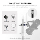 - 5/8" Baby Pin & Threaded Interface- The 4.1"/105mm grip arm with a 5/8" threaded interface seamlessly connects with the grip head, and features a 5/8" baby pin on the other end to mount LED video lights, panel lights, ring lights, strobe flashes, studio lights, mono lights, microphones, softboxes and more. It can be used with a grip head and grip arm for more mounting options