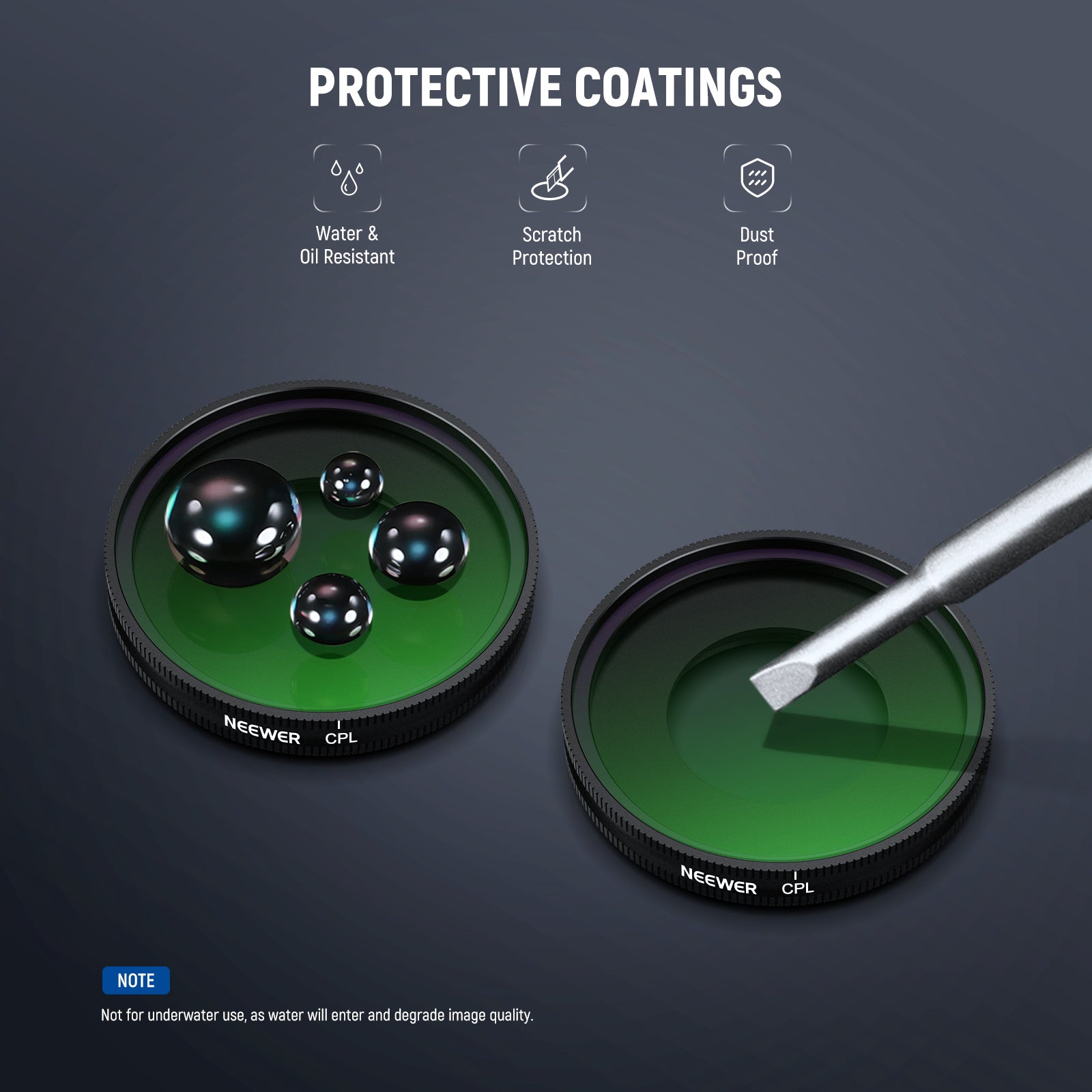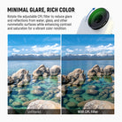 - Minimal Glare, Rich Color- Rotate the adjustable CPL filter to reduce glare and reflections from water, glass, and other nonmetallic surfaces while enhancing contrast and saturation for a vibrant color rendition