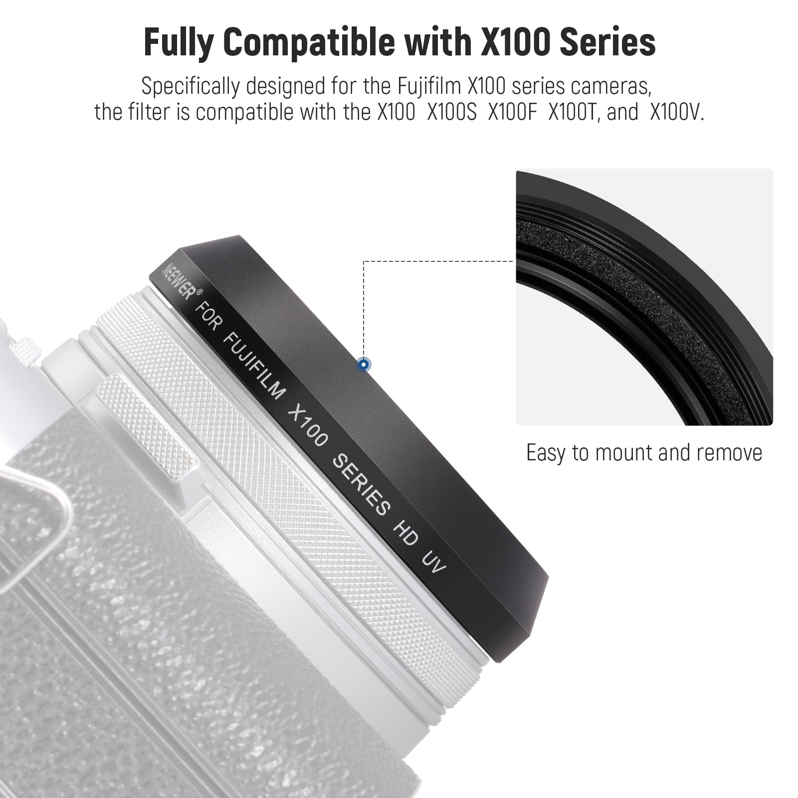 - Fully Compatible with X100 Series- Specifically designed for the X100 series cameras, the filter is compatible with Fujifilm X100 X100S X100F X100T X100V and X100VI. Simply screw the filter on the camera lens, and it will tightly fit. Easy to mount and remove, with no risk of being stuck on your lens