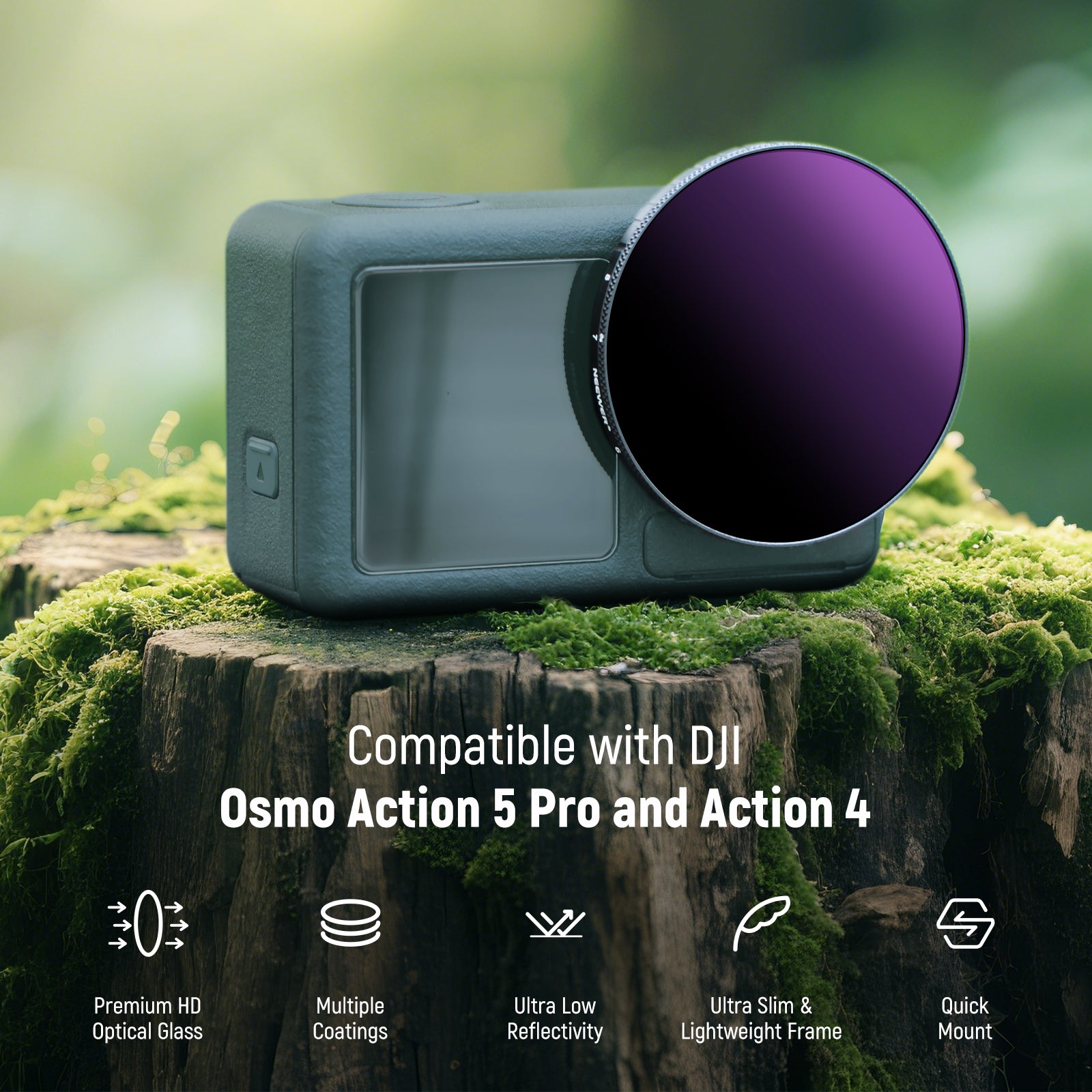 - For Action 5 Pro and Action 4 - Compatible with DJI Osmo Action 5 Pro and Action 4 Adventure Combo, this variable neutral density filter is ideal for a wide range of sports activities, including surfing, kayaking, skiing, mountain biking, skydiving, skateboarding, and hiking as content creator essential photography accessories and influencer must have gear