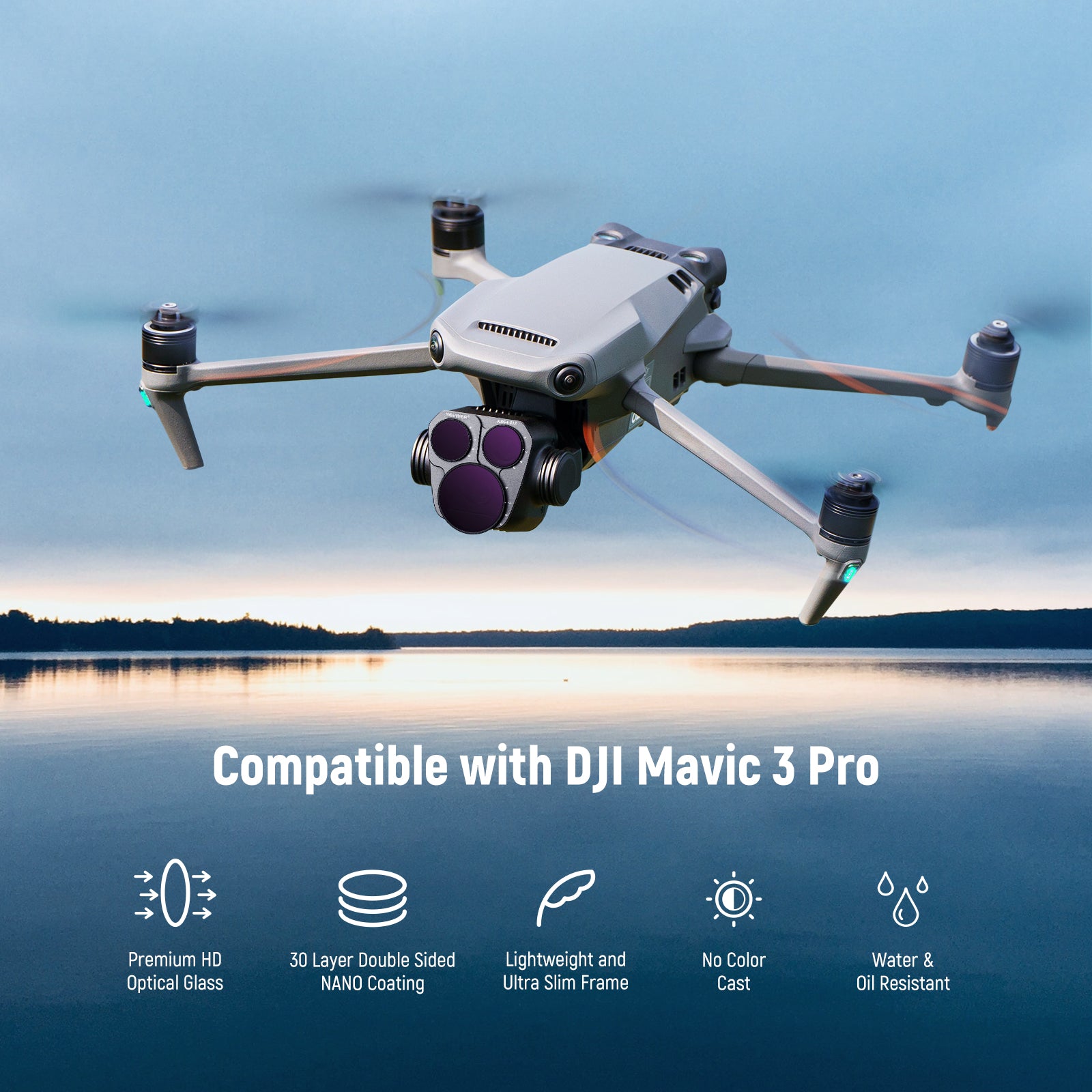 - Dedicated to Mavic 3 Pro/Pro Cine- Introducing the latest must have Variable ND filter set designed specifically for the Mavic 3 Pro/Pro Cine's three lens gimbal system - a game changer for all avid drone photographers and videographers. These VND filters offer a easy way to adjust the amount of light entering the camera, allowing for precise exposure control in various lighting conditions