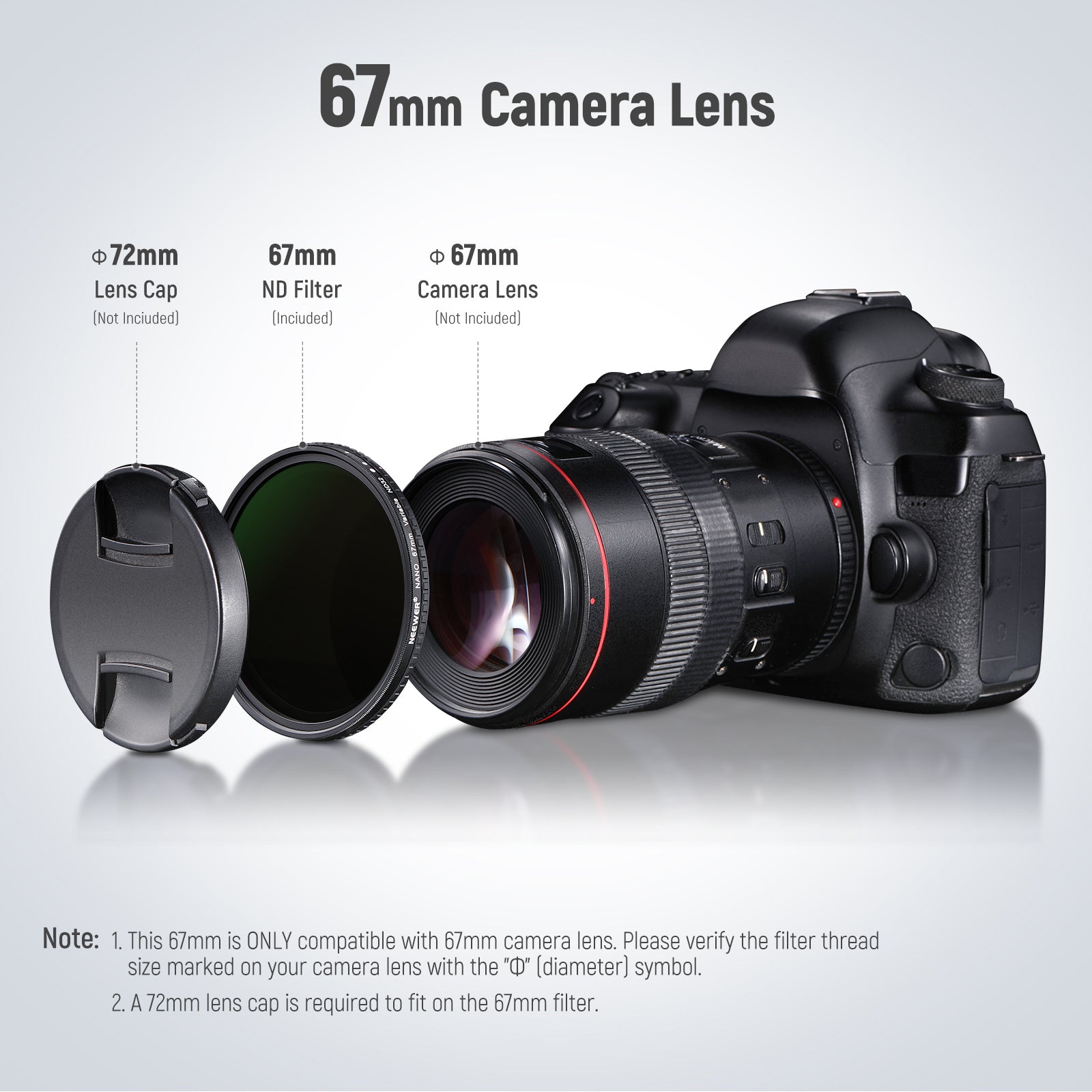 - About its Compatibility- This ND filter can only fit a same-size camera lens. Please confirm the filter thread size marked on your camera with the "Ф" (diameter) symbol before ordering. When mounted on the camera, the ND filter also protects your camera lens from scratches. A protective case and cleaning cloth are also included.
