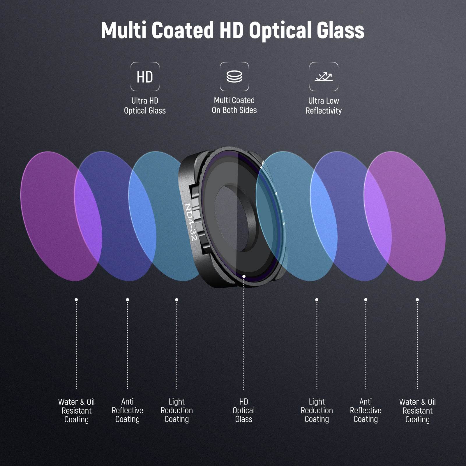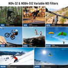 - Variable & Precise Light Control- Hard stops at both ends limit neutral density between ND4 and ND32 (2 and 5 stops) or ND64 and ND512 (6 and 9 stops). Simply rotate the action camera lens filter to the exact marked stop to achieve desired light reduction levels for accurate exposure control and capture moving subjects with expressive motion blur effects
