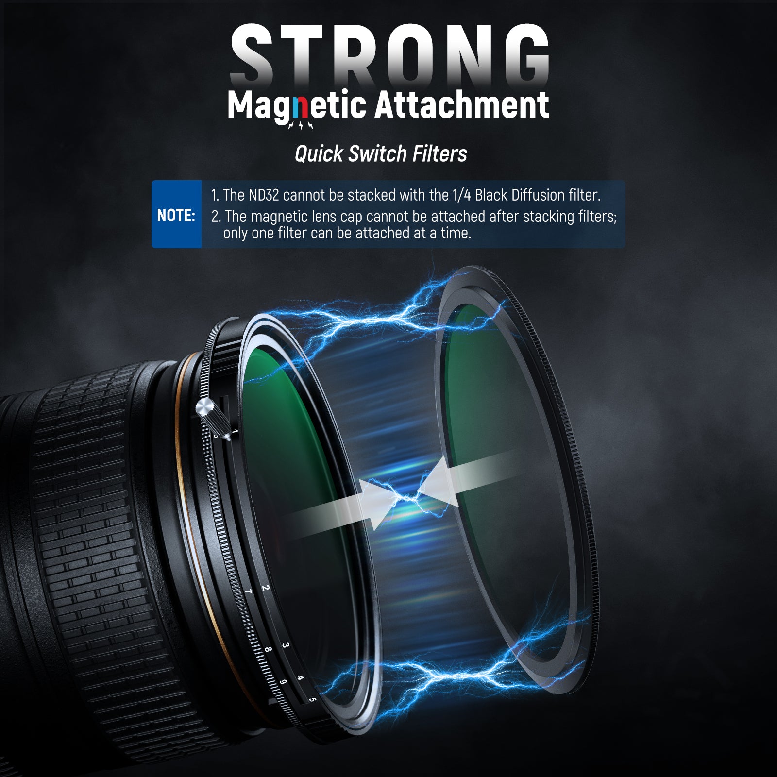 - Magnetic Stackable ND32 Filter- Includes an additional magnetic ND32 neutral density filter, effectively reducing light by 5 stops to address brighter sunlight conditions. This filter can be layered onto the 2 in 1 ND&CPL filter to provide extended light reduction choices, ranging from 6 to 9 stops. Please note that the ND32 cannot be used simultaneously with the Black Diffusion filter or the lens cap