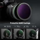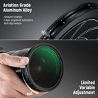 - 2 in 1 Variable ND & CPL Filter- Combine limited VND and CPL functions within a single filter. This 2 in 1 ND2-ND32 & CPL filter (nonmagnetic) reduces incoming light by 1-5 stops with the putters, effectively preventing overexposure in bright conditions, capturing motion blur images, and eliminating unwanted reflections from nonmetallic surfaces like water and glass through frame rotation. Even wide angle shots remain free from dark corners or vignetting