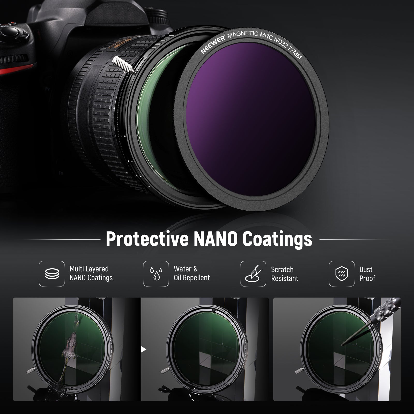 - Advanced NANO Coatings & Durable Frame- With 30 layers of multi functional NANO coatings on both sides of the HD optical glass, these filters are water repellent, scratch resistant, and oilproof. The aluminum alloy frame is lightweight and durable