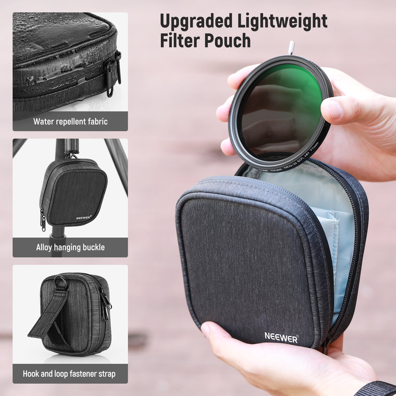 - Protective Lens Cap & Carrying Bag- The magnetic metal lens cap protects your lens and filter from dust, scratches, and fingerprints when idle (nonmagnetic lenses require an additional magnetic adapter ring). The water repellent carrying bag boasts cushioned pockets and a dual zipper closure for organized storage