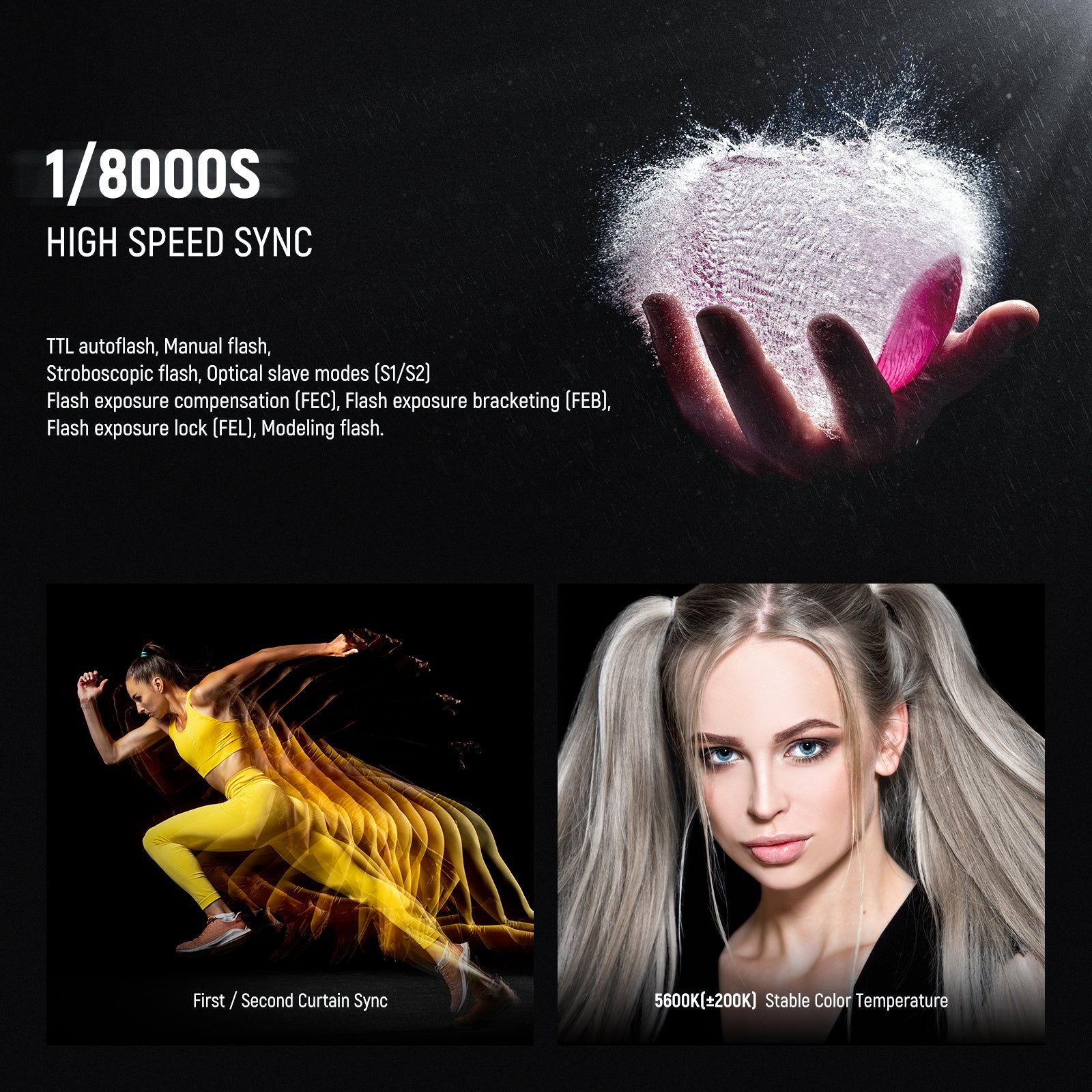 - Sync Methods: High-speed sync (up to 1/8000s), first/second curtain sync