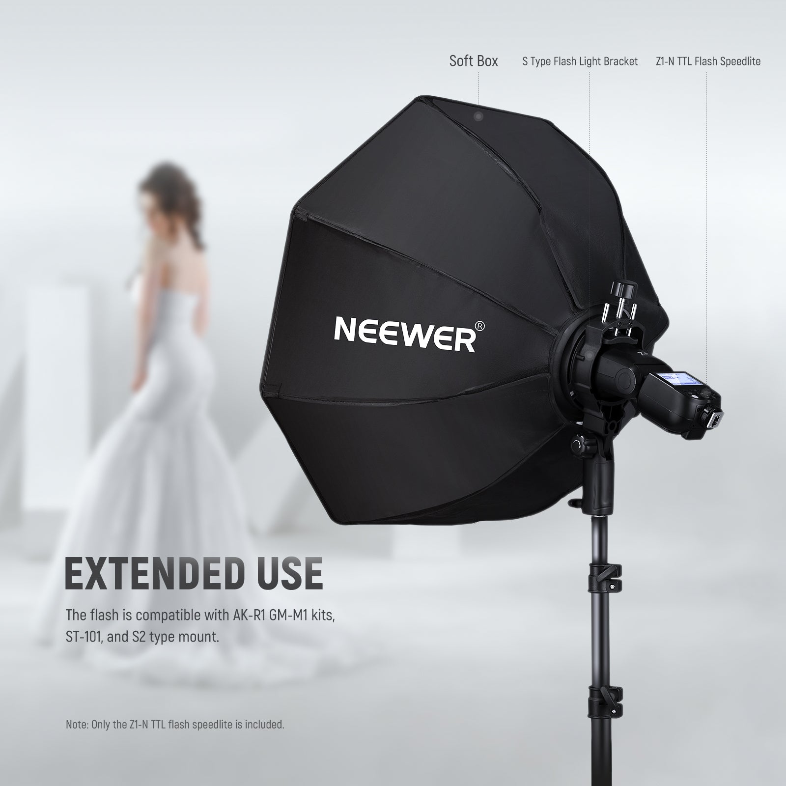 - Perfect Lighting Effect- The NEEWER Z1-N flash features a circular Fresnel head, which produces a more even light distribution from center to edge, with softer, more natural falloff at the edges and stunning lighting effect. The color temperature remains stable at 5600K (±200K). The flash zoom head (28–105mm) can be set automatically or manually. And 2W LED modeling lamp has 10 adjustable brightness levels from 01 to 10